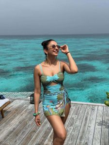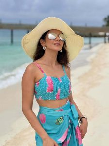 নজর কাড়ার মতো একটি লুকে তাকে দেখা যায় নীল-অলিভ টোনের ট্রপিক্যাল-প্রিন্ট মনোকিনিতে, যার সঙ্গে ছিল একটি ছোট স্কার্ট। ডার্ক সানগ্লাস ও মিলিয়ে পরা চুড়ি পুরো লুকটিকে দিয়েছে বাড়তি গ্ল্যামার। আরেকটি ছবিতে তিনি হাজির হন ফুলেল ব্যান্ডিউ টপ ও সারং-স্টাইলের স্কার্টে, সঙ্গে প্রশস্ত স্ট্র হ্যাট, যা ছুটির মুডকে আরও বাড়িয়ে তোলে।