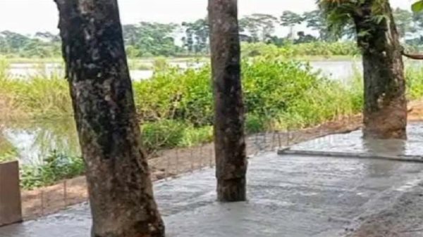 গোয়াইনঘাটে সড়কের মাঝখানে গাছ রেখেই ঢালাই সম্পন্ন